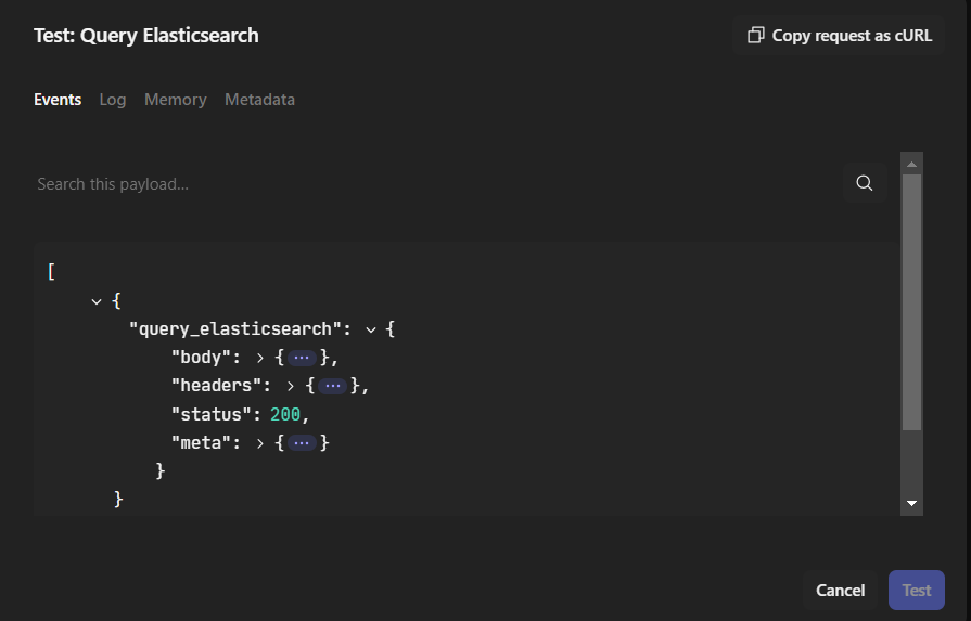 - Configure the request parameters, including Elasticsearch credentials, endpoint, and query body.